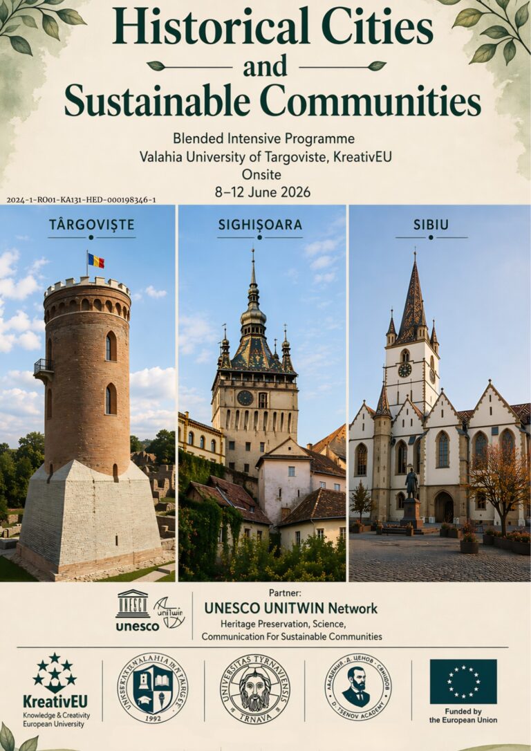 Valahia University of Târgoviște, in collaboration with the KreativEU Alliance of European Universities, Trnava University in Trnava and D. A. Tsenov Academy of Economics, in partnership the UNESCO UNITWIN Network „Heritage Preservation, Science, Communication for Sustainable Communities”, invites you to join a prestigious academic initiative focused on Europe’s historic urban environments.
